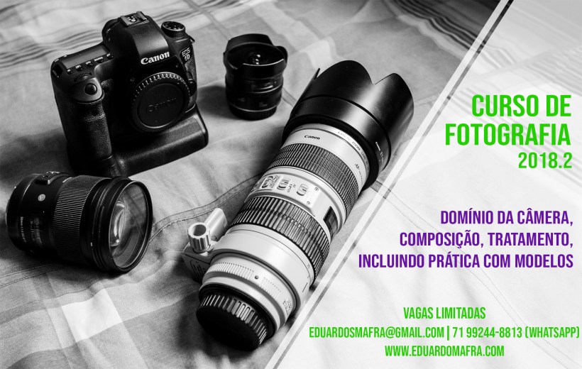 Com muita alegria anuncio a abertura da segunda turma de fotografia profissional do ano de 2018! O curso irá se realizar nos dias primeiro, 8 e 15 de setembro, das 8h às 12h nos dias primeiro e oito e das 8h às 18h no dia 15 (intervalo para almoço das 12h às 14h), já que neste dia a prática será realizada no período da tarde. O curso será oferecido no estúdio fotográfico no Jardim dos Pássaros, Estrada do Coco, Lauro de Freitas.